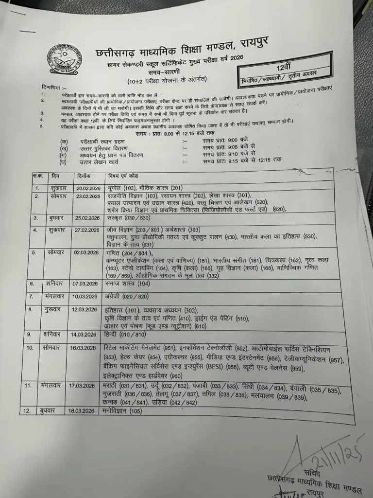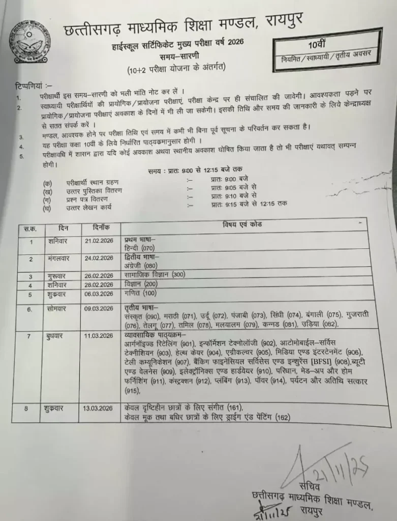 बोर्ड सचिव पुष्पा साहू ने जानकारी देते हुए बताया कि 12वीं बोर्ड परीक्षा (12th Board Time Table) 20 फरवरी 2026 से शुरू होकर 18 मार्च 2026 तक चलेगी। वहीं 10वीं बोर्ड परीक्षा (10th Board Time Table) 21 फरवरी 2026 से शुरू होकर 13 मार्च 2026 तक संपन्न होगी।