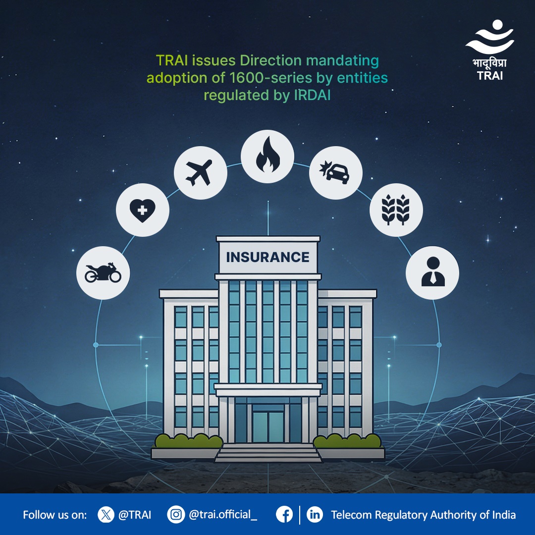 भारतीय दूरसंचार नियामक प्राधिकरण (ट्राई) ने 16 दिसंबर 2025 को एक अहम निर्देश जारी करते हुए भारतीय बीमा नियामक और विकास प्राधिकरण (आईआरडीएआई) द्वारा विनियमित सभी संस्थाओं के लिए ‘1600’ श्रृंखला वाले फोन नंबर अपनाना अनिवार्य कर दिया है। बीमा कंपनियों को उपभोक्ताओं से सेवा और लेनदेन से जुड़ी कॉल करने के लिए 15 फरवरी 2026 तक इस नंबर श्रृंखला को अपनाना होगा। यह आदेश आईआरडीएआई के परामर्श से जारी किया गया है।