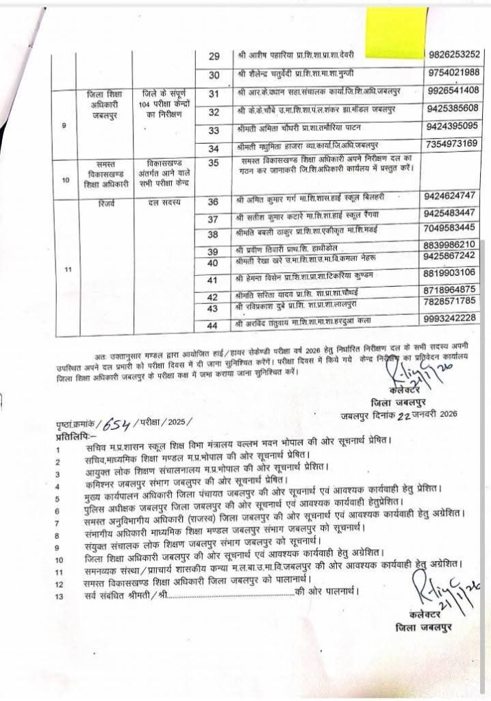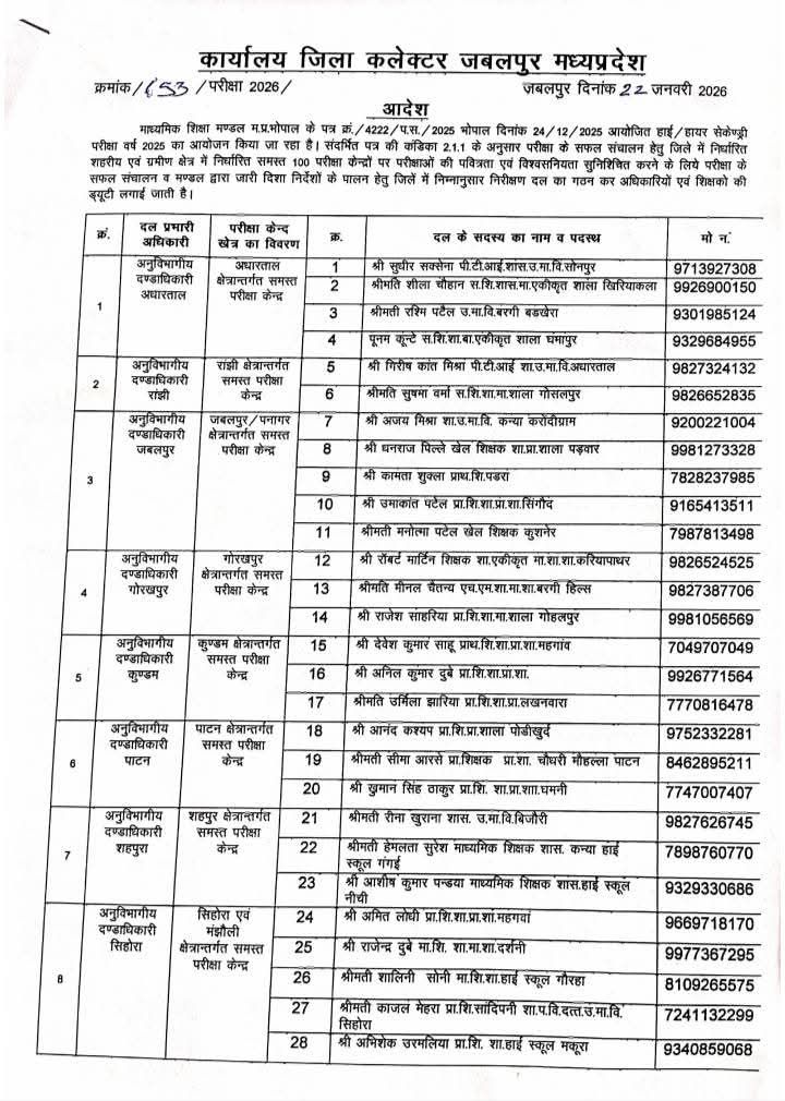 जबलपुर जिले में मध्य प्रदेश माध्यमिक शिक्षा मण्डल (MPBSE) की आगामी हाई स्कूल (कक्षा 10वीं) और हायर सेकेंडरी (कक्षा 12वीं) परीक्षाओं को पूरी तरह निष्पक्ष, पारदर्शी और नकल मुक्त बनाने के लिए फ्लाइंग स्क्वाड (उड़न दस्ता) का गठन किया गया है।